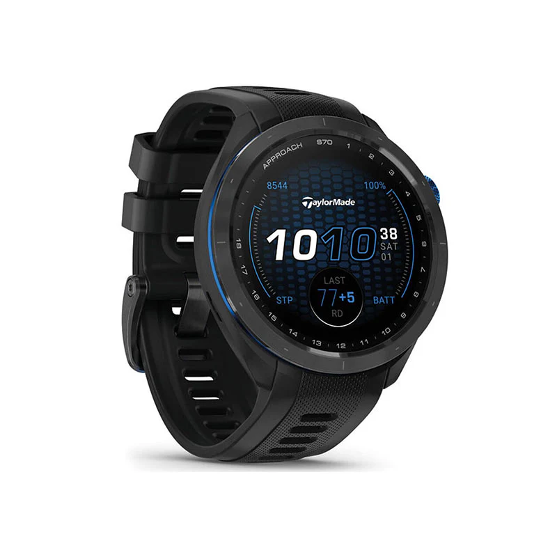 Limited edition smartwatch created in collaboration with TaylorMade, featuring a Metal-T logo on the crown and a blue ring around the bezel.