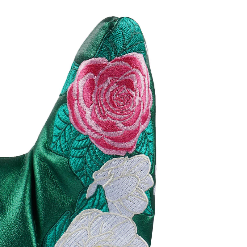 Elegant green base with embroidered TM logo and vibrant floral accents symbolizing spring