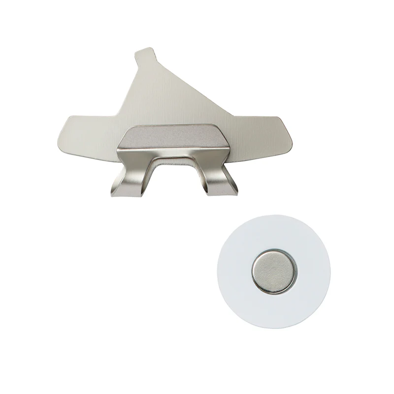 This cap ball marker comes with a base inspired by the face of a truss putter, featuring a marker that replicates the curvature and dimple texture of a golf ball.